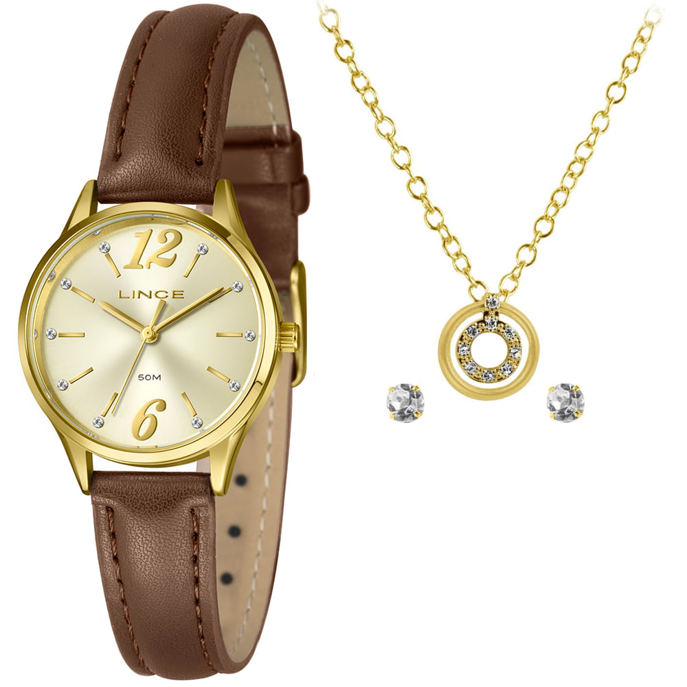 Relógio LINCE KIT dourado couro marrom LRCH240L30 K0G3C2NX