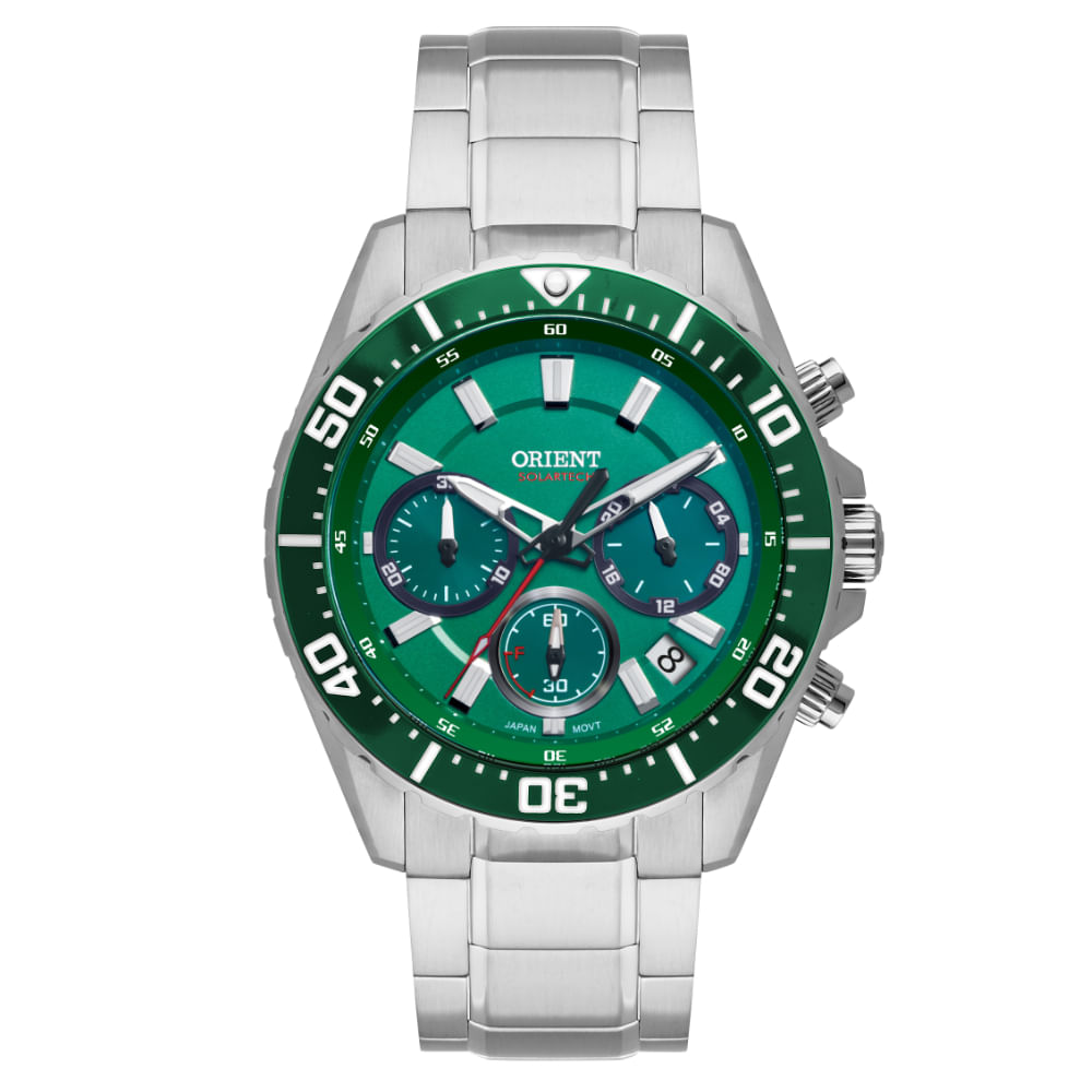 Relógio ORIENT cronógrafo solar verde prata MBSSC288 E1SX