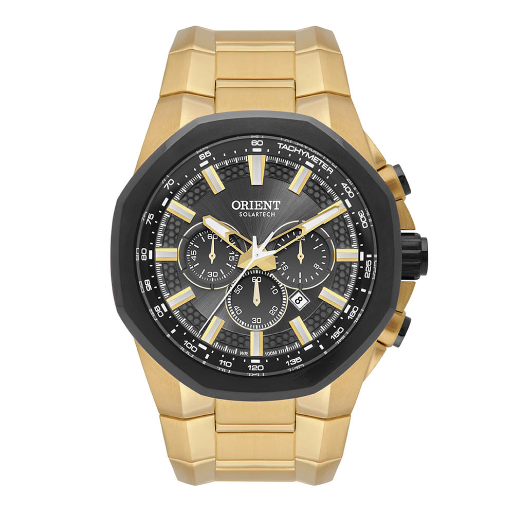 Relógio ORIENT solar cronógrafo dourado preto MGSSC058 G1KX