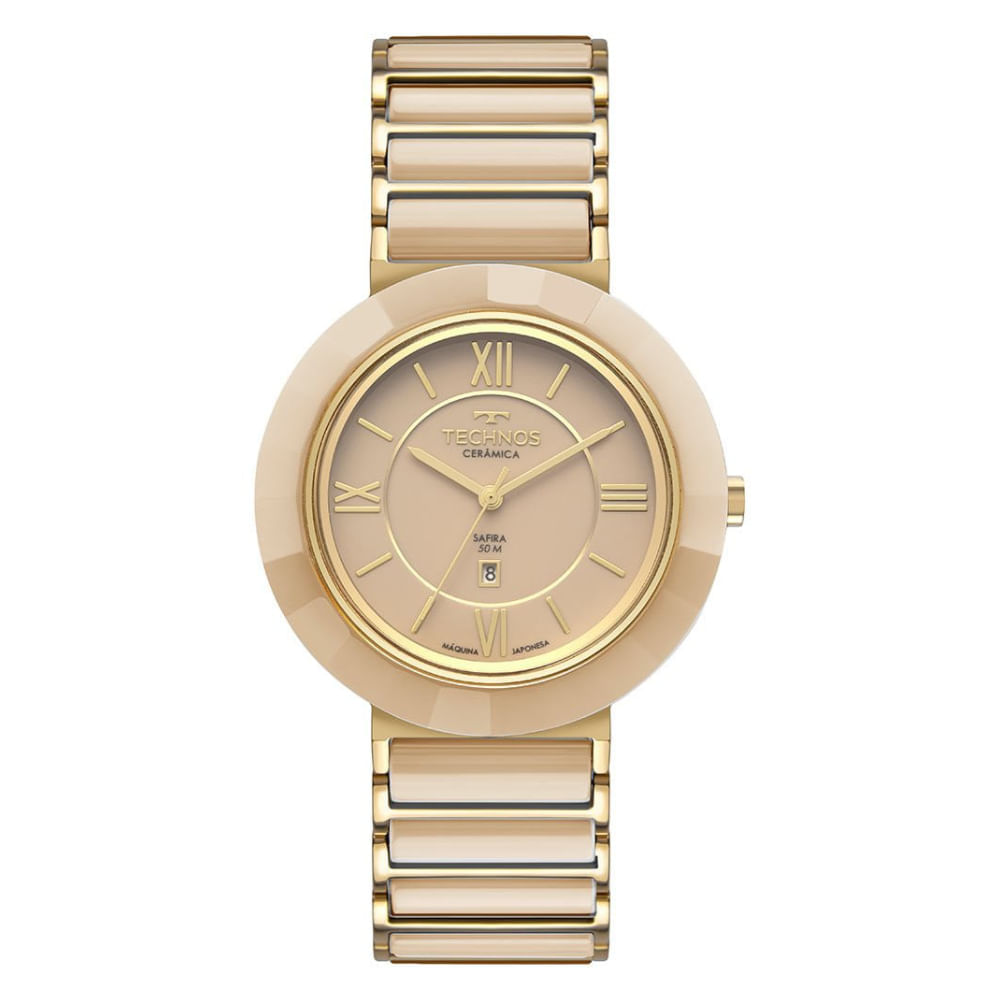 Relógio TECHNOS cerâmica safira bege dourado 2015BV/1X - Relógio TECHNOS feminino analógico quartz cerâmica 2015BV/1X