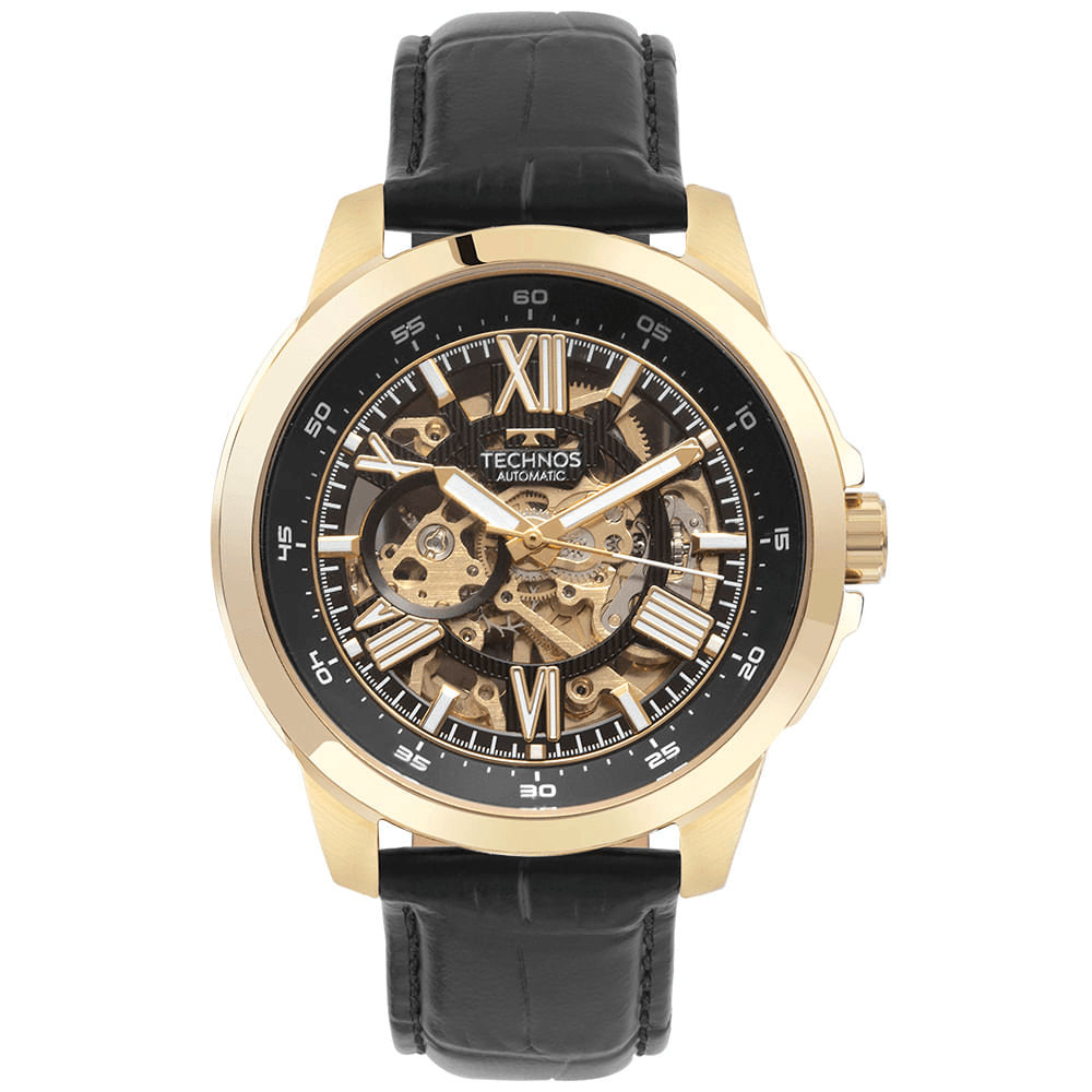 Relógio TECHNOS automático couro preto dourado G3265AO/0P